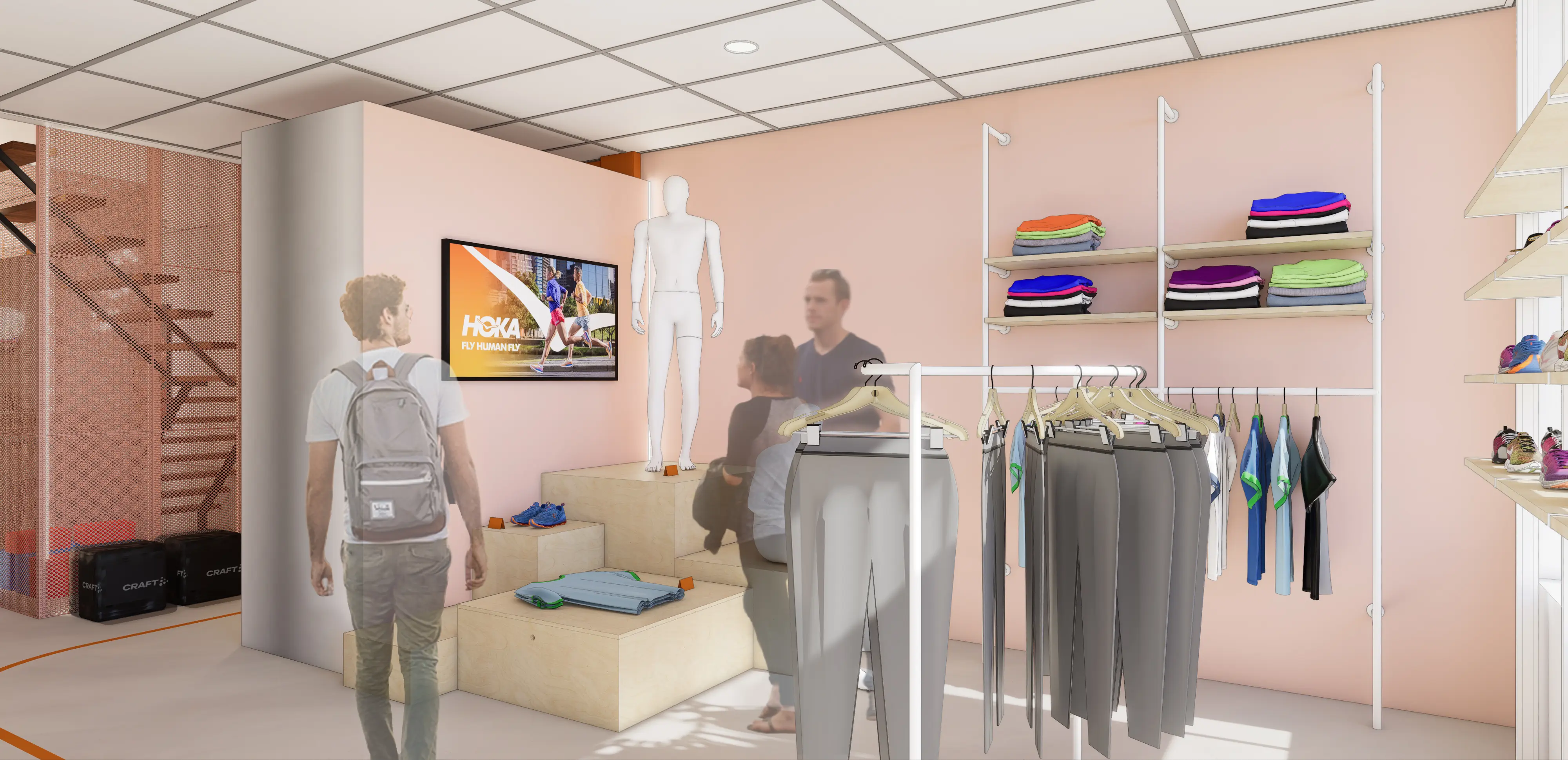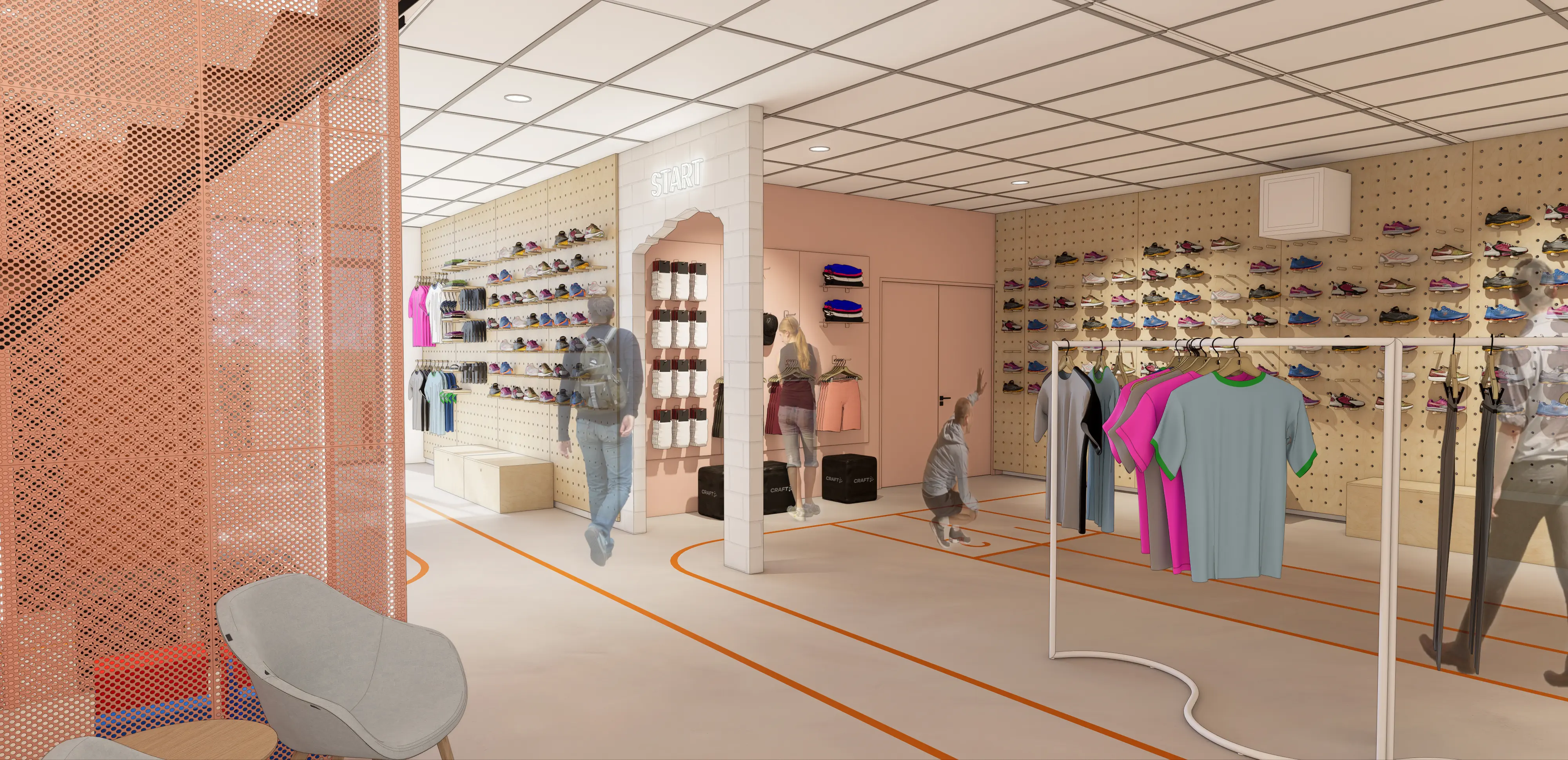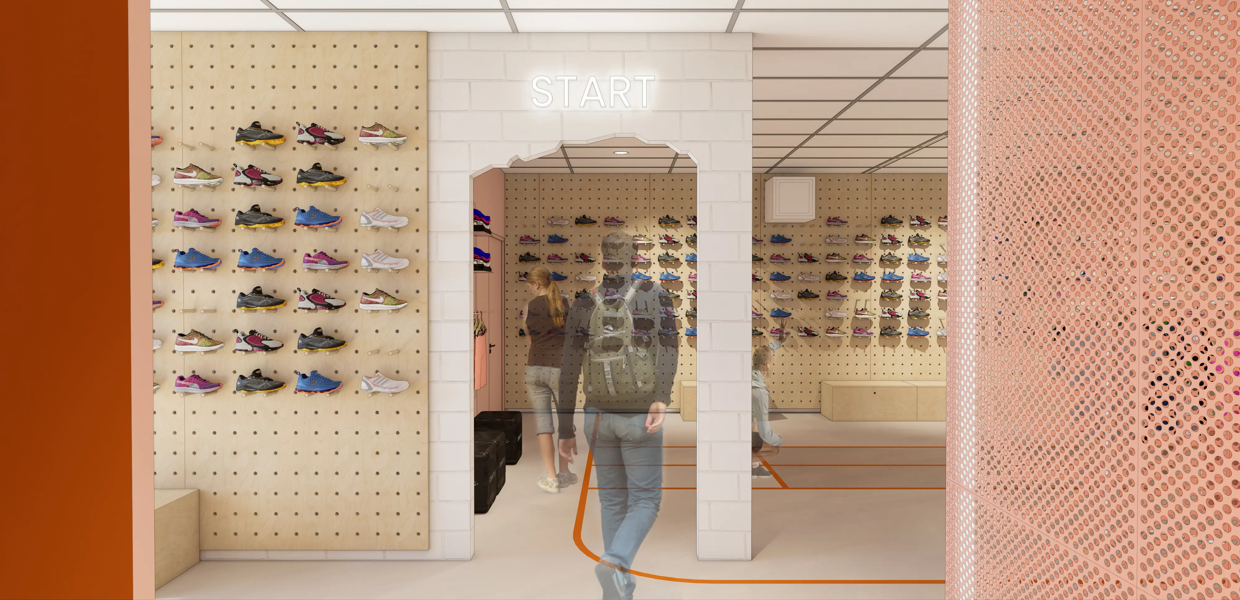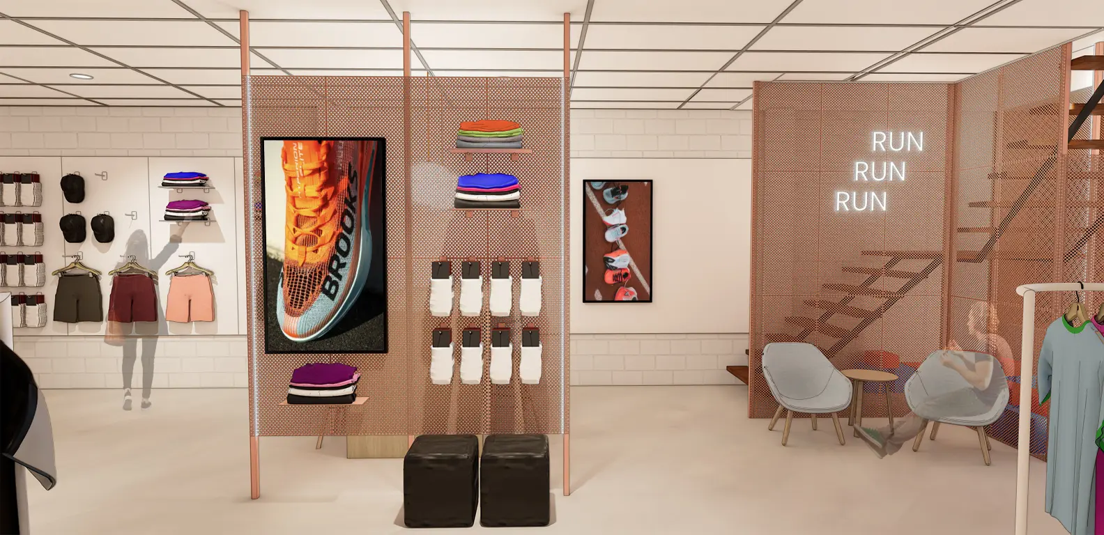 Door de basis van de inrichting fris en licht te houden, krijgen de – over het algemeen – kleurrijke hardloopschoenen en sportkleding alle aandacht.