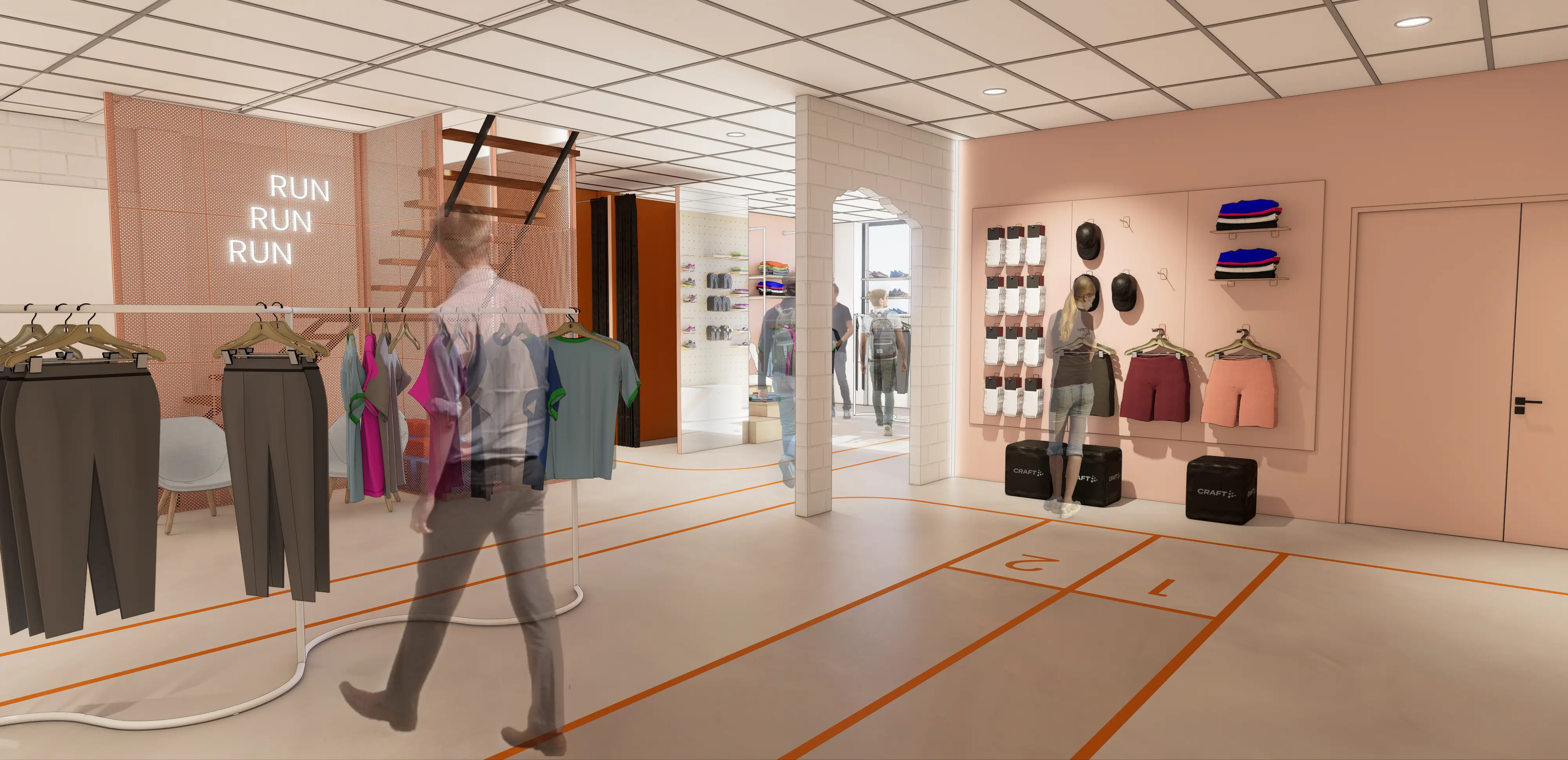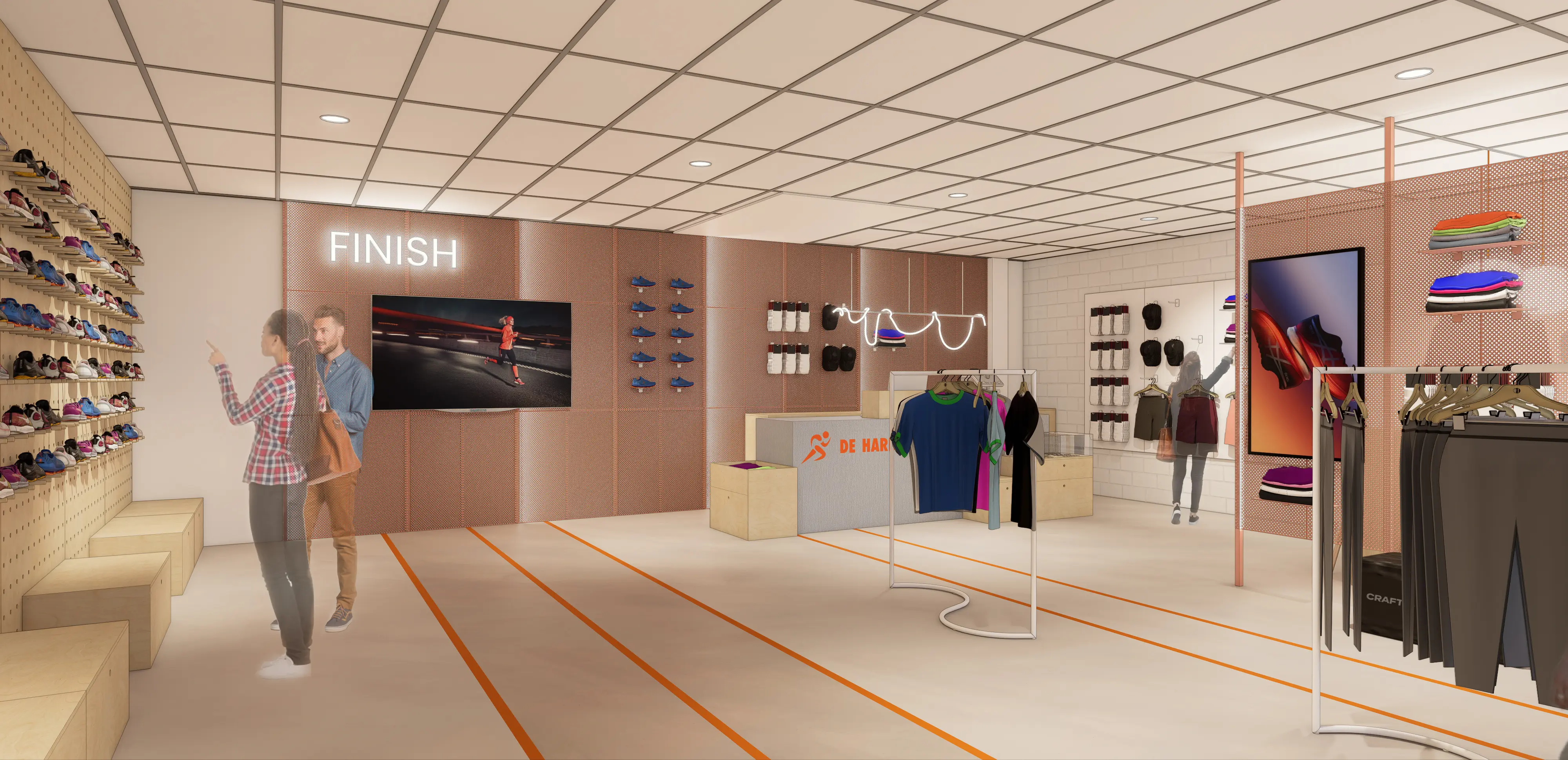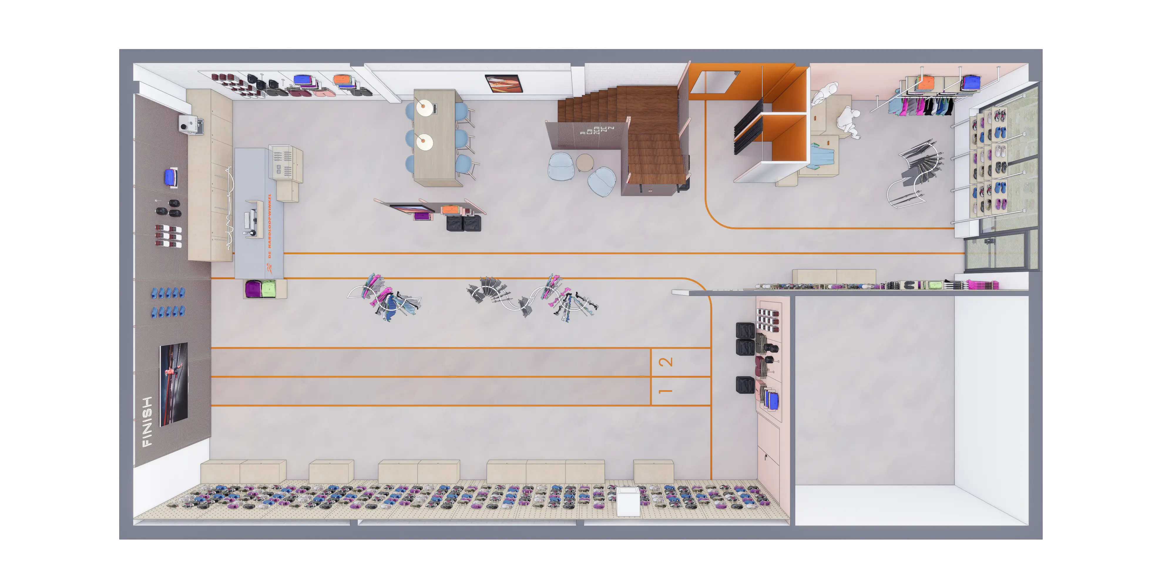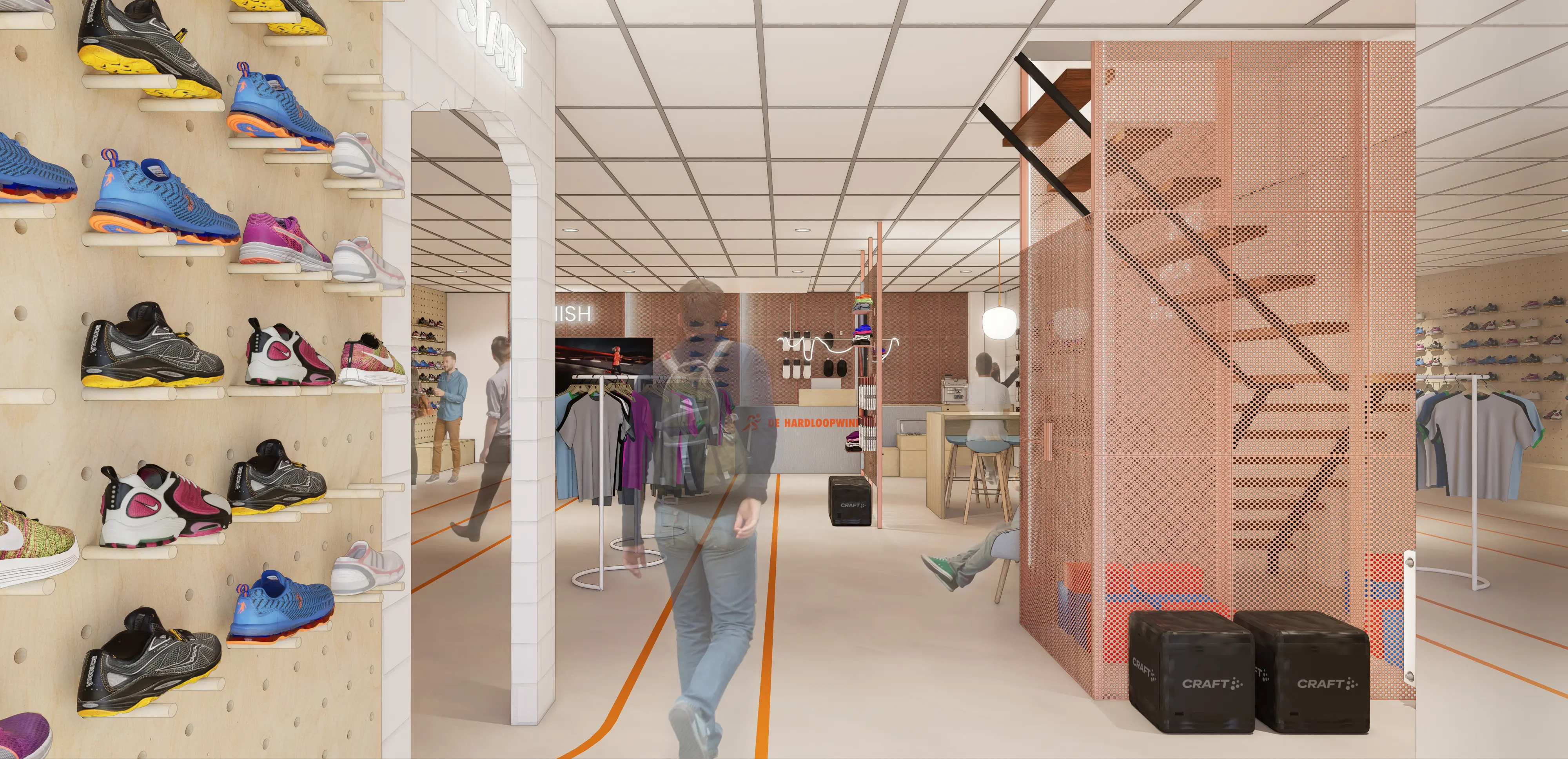 Daarnaast hebben we signing toegepast in de huisstijlkleuren en het lettertype van De Hardloopwinkel, onder andere verwerkt in de vloer.