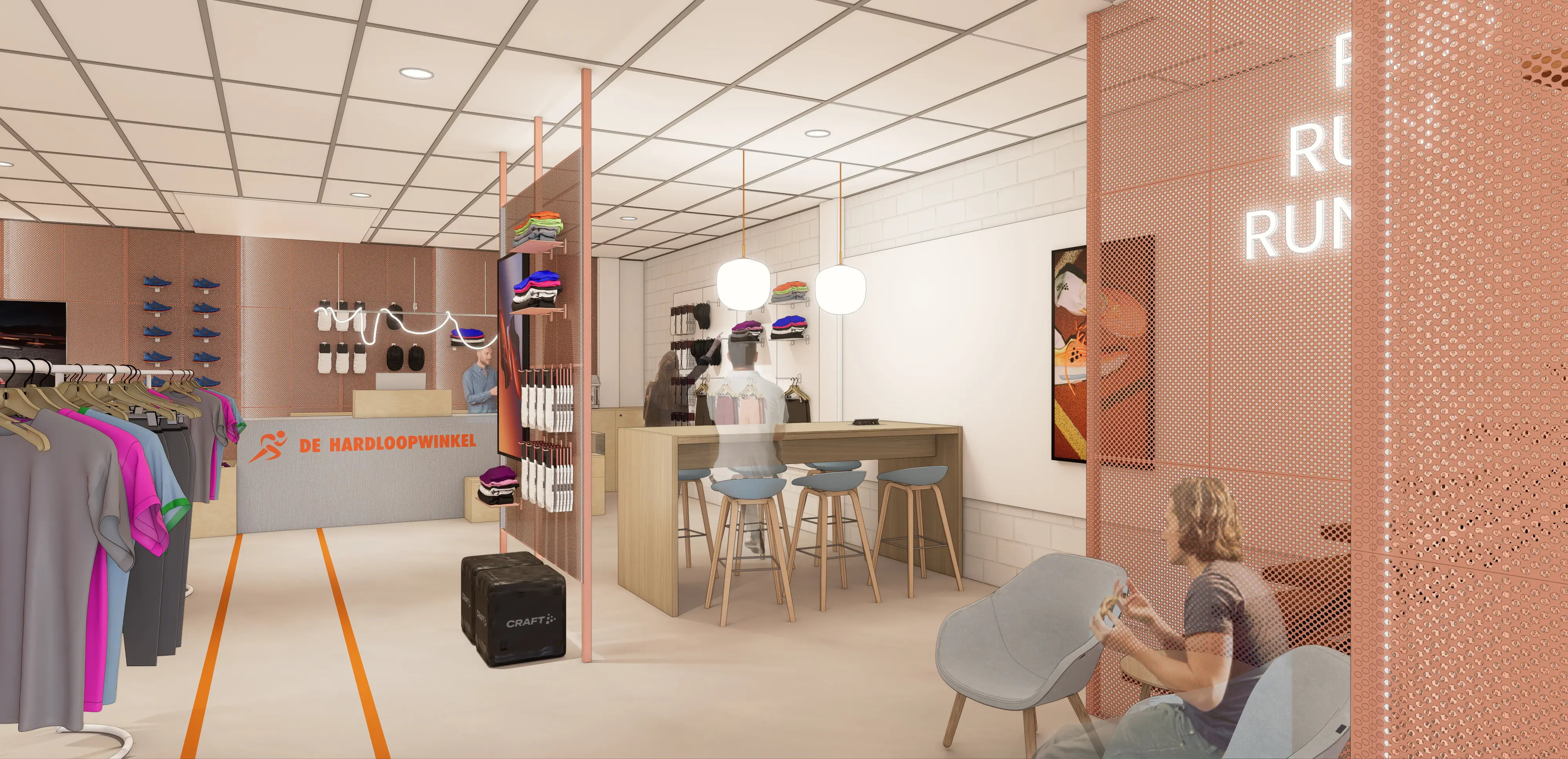 Het resultaat is een lichte, overzichtelijke en flexibele winkelruimte waarin de producten centraal staan en de identiteit van De Hardloopwinkel duidelijk voelbaar is in het gehele ontwerp.
